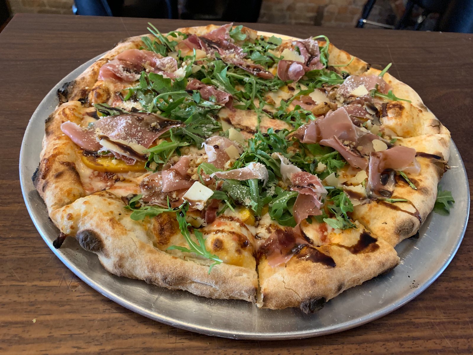 Prosciutto, Georgia Peaches, arugula, pecan-parmesan dusting, pecan ridge truffle oil, balsamic-Alaga Cane Sugar Syrup glaze